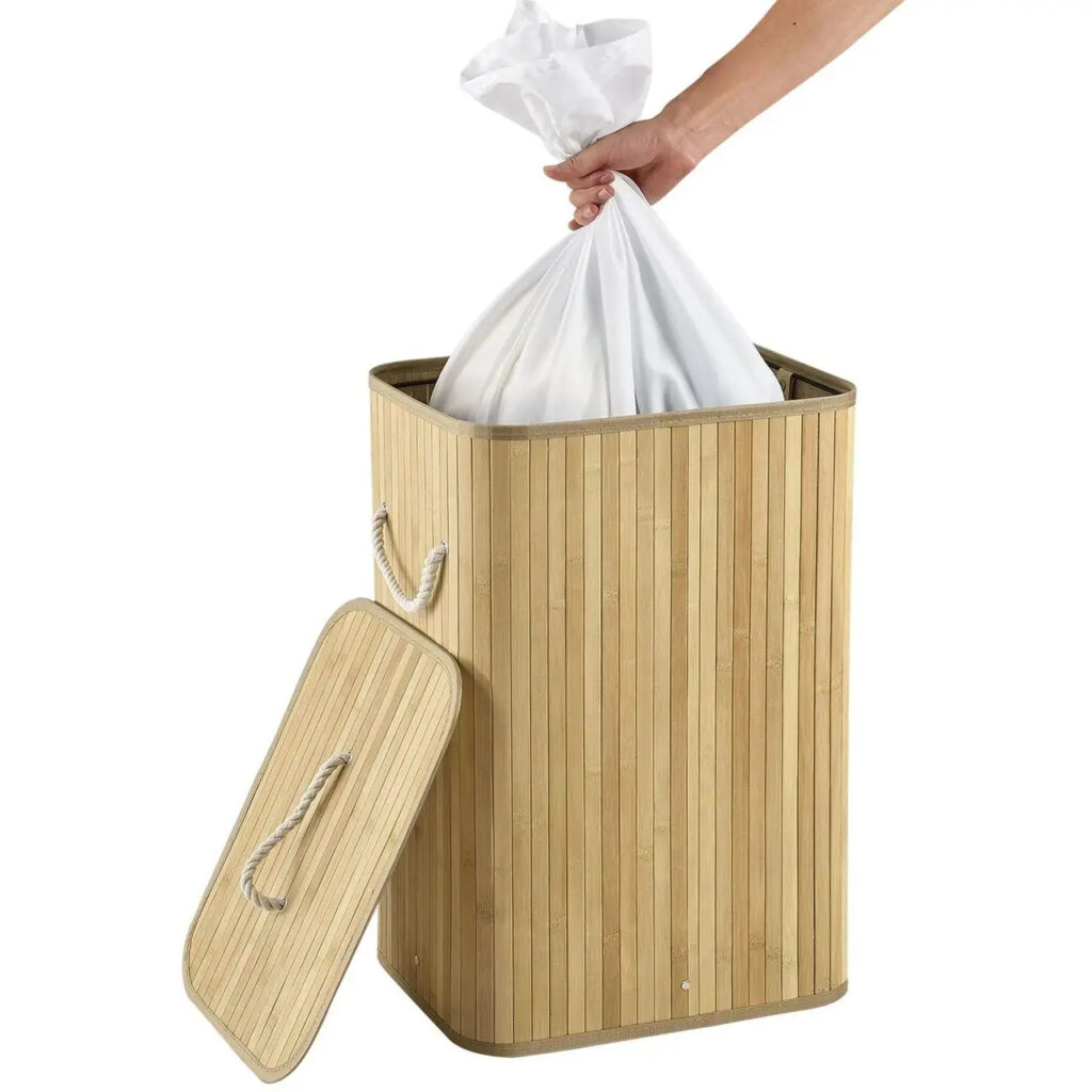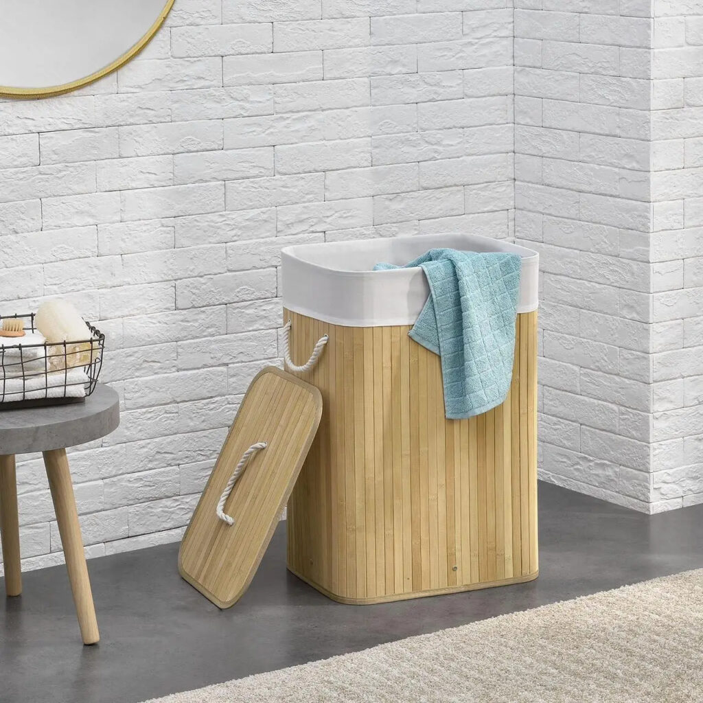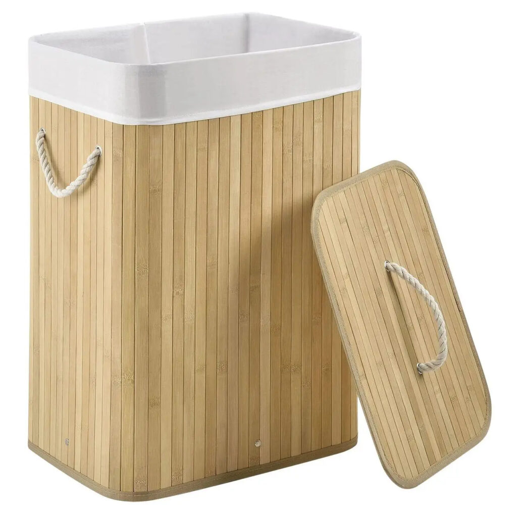Прямокутний кошик для білизни виглядає яскраво та сучасно завдяки натуральному бамбуковому вигляду. Кошик прикрасить кожну спальню, ванну чи дитячу.