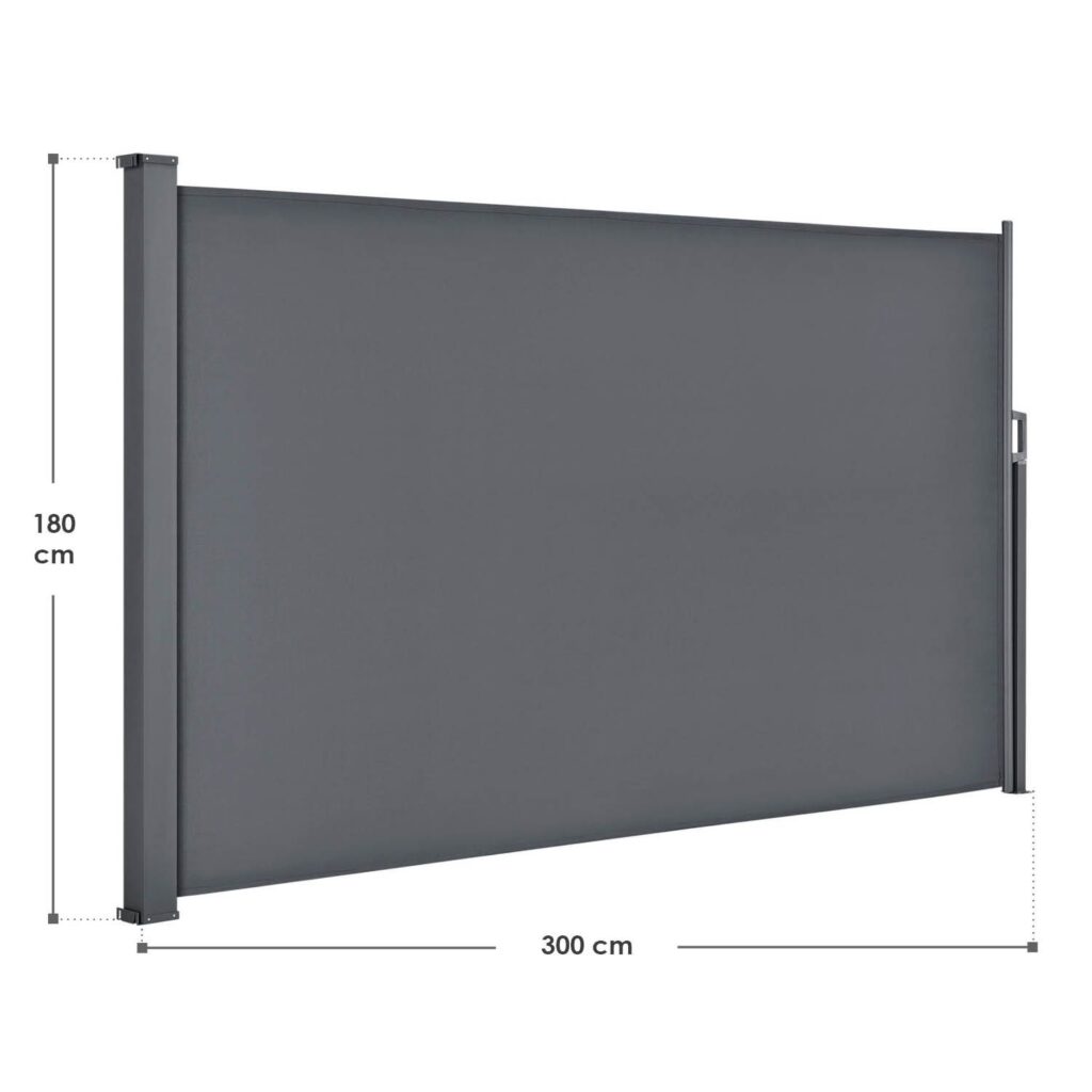 Оскільки бічна маркіза згортається в касету, ви можете просто розтягнути тканину до потрібної довжини. Це дає вам можливість налаштувати тент відповідно до ваших потреб, щоб захистити свій внутрішній дворик або сад від сонця та вітру. Загалом сучасна перегородка має висоту 1,80 м та максимальну довжину 3 м.