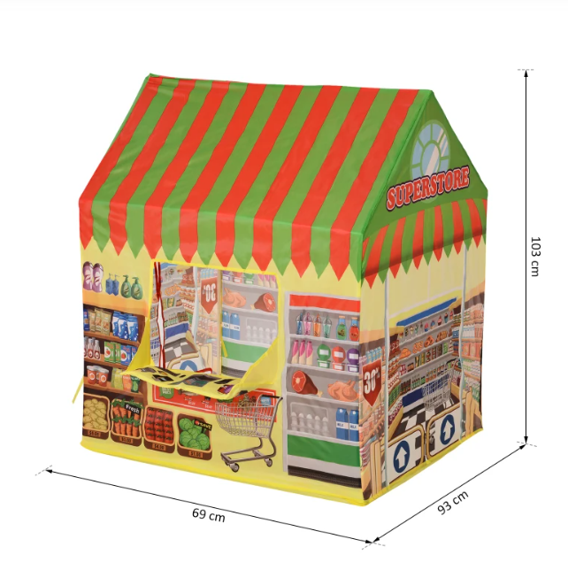 Діти можуть бавитись в наметі імітуючи похід до супермаркету. Цікавий, яскравий та різнокольоровий дизайн. Ваші діти весело проведуть час за читанням, грою та розвагами в цьому безпечному, довговічному та екологічно чистому ігровому наметі. Великі двері та вікно забезпечують оптимальну вентиляцію, і ви завжди можете спостерігати за своїми малюками. Легко та швидко збирається. Здійсніть дитячу мрію та придбайте намет прямо зараз!