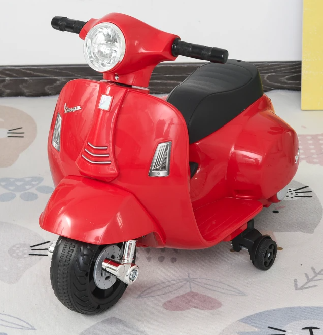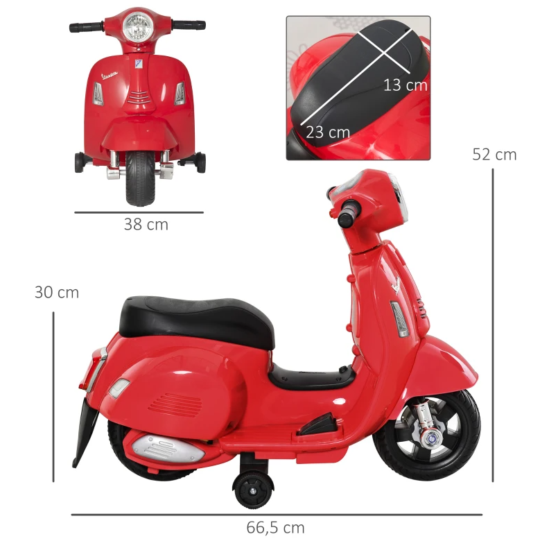 МАКСИМАЛЬНЕ НАВАНТАЖЕННЯ 25 КГ. ДЛЯ ВІКУ 18-36 МІСЯЦІВ. ЛЕГКО ЗБИРАТИ.Багато пригод чекає на ваших дітей з цією ліцензованою дитячою моделлю Vespa від HOMCOM. Вигнуте сидіння зі шкірозамінника забезпечує високий рівень комфорту під час водіння, а працюючий звуковий сигнал та фари дарують реальні та захоплюючі відчуття від водіння. Vespa оснащена двома великими колесами та двома знімними стабілізаторами, які забезпечують велику безпеку та баланс. Вашим дітям сподобається грати на вулиці із цим електричним мотоциклом HOMCOM.