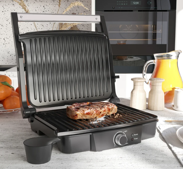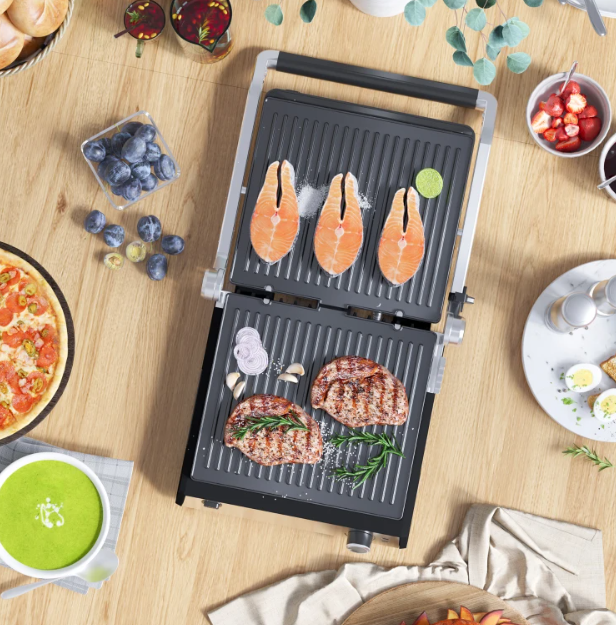 ✔ Кришка гриля відкривається на 180° і функціонує як сендвічниця або як двосторонній гриль