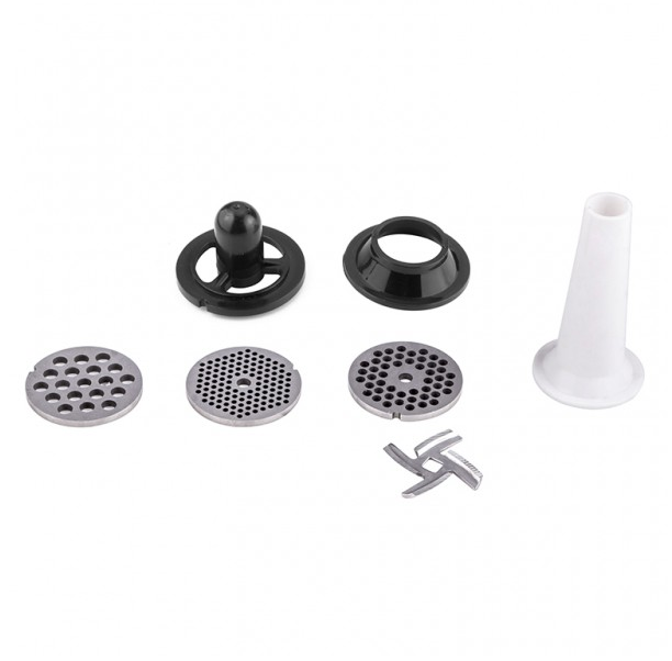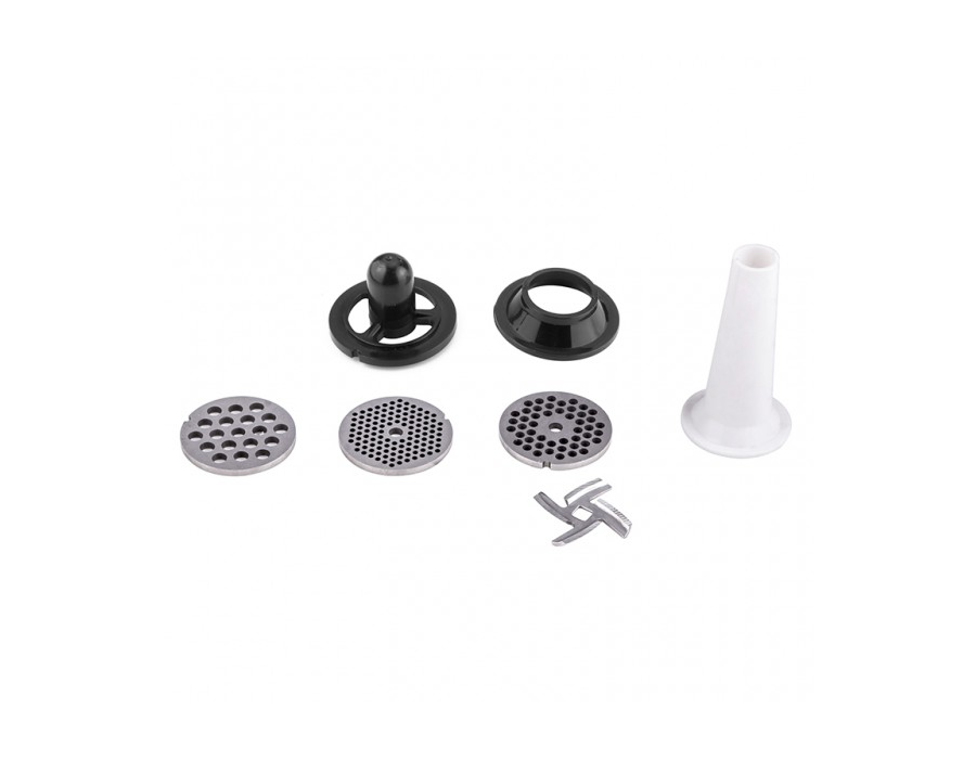 -Комплектація м’ясорубки: горловина, шнек, лоток, ніж, 3 перфорованих диски (3,5,7 мм), насадка для ковбасних виробів, насадка для печива