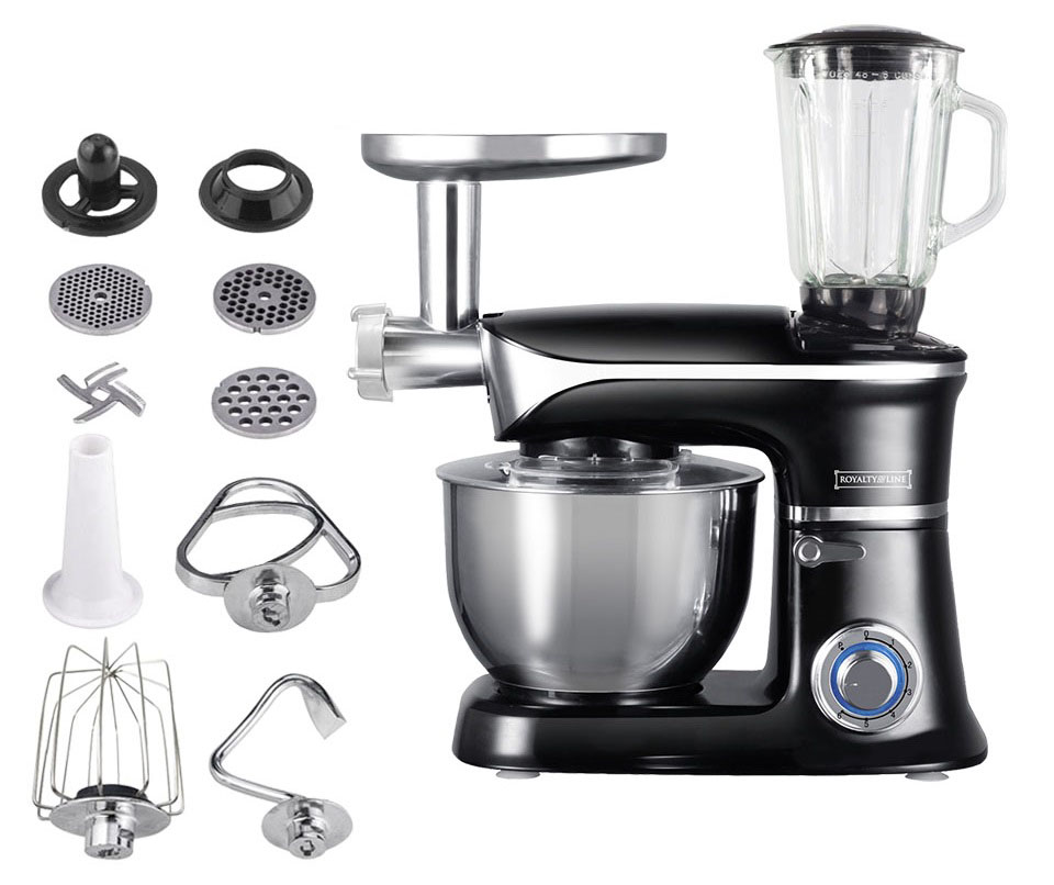 Кухонний комбайн 3в1 Royalty Line RL-PKM-1900.7BG ― виконаний із міцних матеріалів, верх ― щільний пластик, чаша для замісу тіста виконані з нержавіючої сталі, м’ясорубка та всі аксесуари із міцного сплаву металу, чаша блендера виконана з товстого скла.