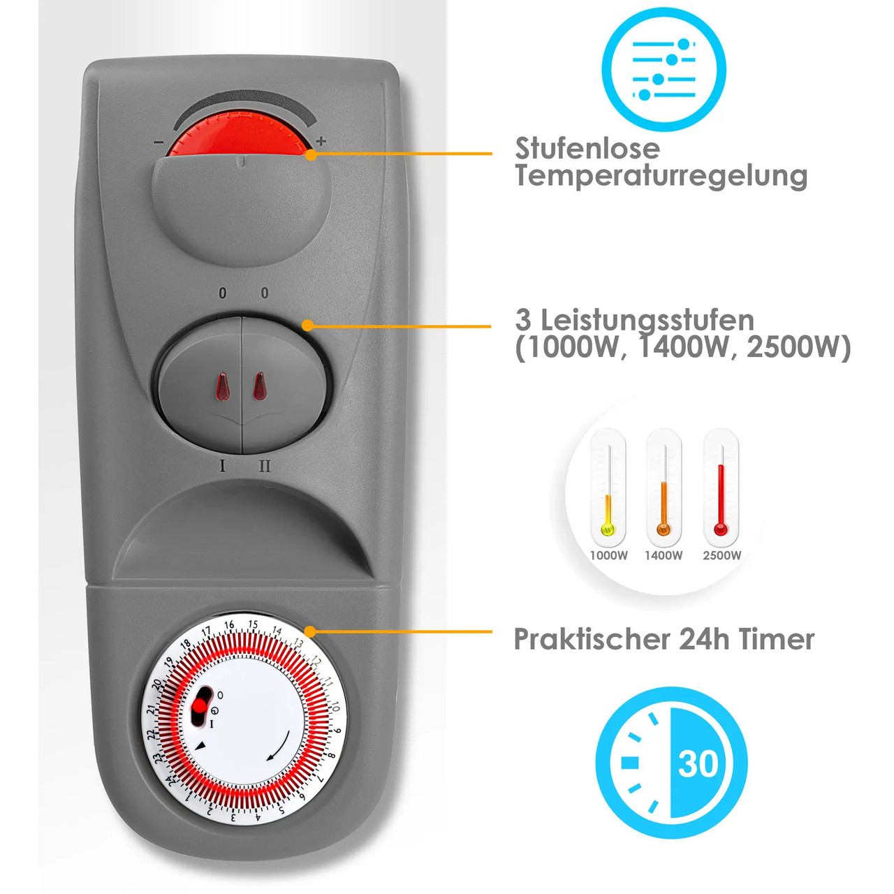 – 3 рівні регулювання: 1000 Вт, 1400 Вт і 2500 Вт