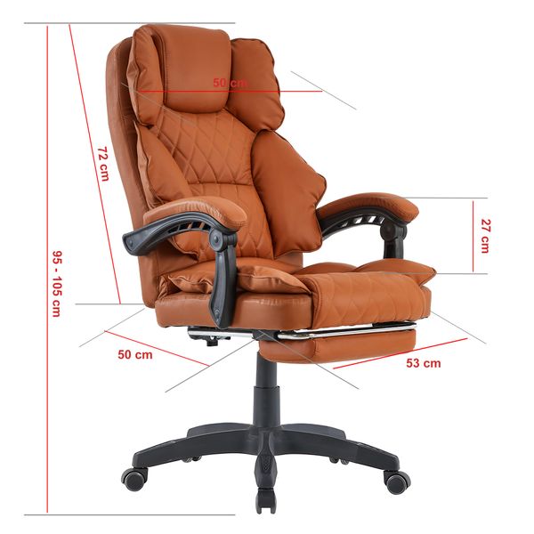Гнучке крісло з елегантним дизайном, що імітує шкіру. Це офісне крісло оснащене м’якими гнучкими триточковими підлокітниками. Його можна встановити розслаблююче положення, а підлокітники адаптуються до цього положення. Для максимального розслаблення м’яку підставку для ніг можна вийняти. Крісло, що обертається, можна регулювати по висоті, а так само можна регулювати нахил спинки.