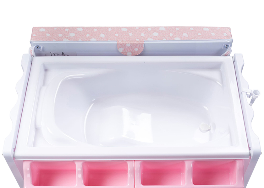 – проста трансформація пеленального столика в столик з ванною для купання, яка розташована безпосередньо під пеленальною поверхнею. Для проведення водних процедур матрацик опускається у бік, де він звисає на спеціальних кріпленнях;