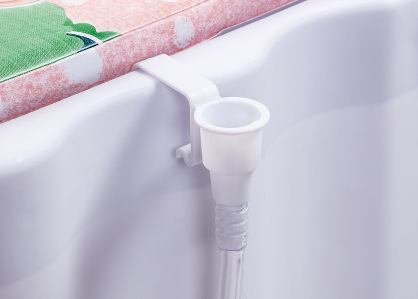 – ванна ергономічної форми оснащена трубкою для зливу води. Ванна розташована на висоті, зручній для дорослих, яким не доводиться сильно нагинатися, щоб купувати дитину;