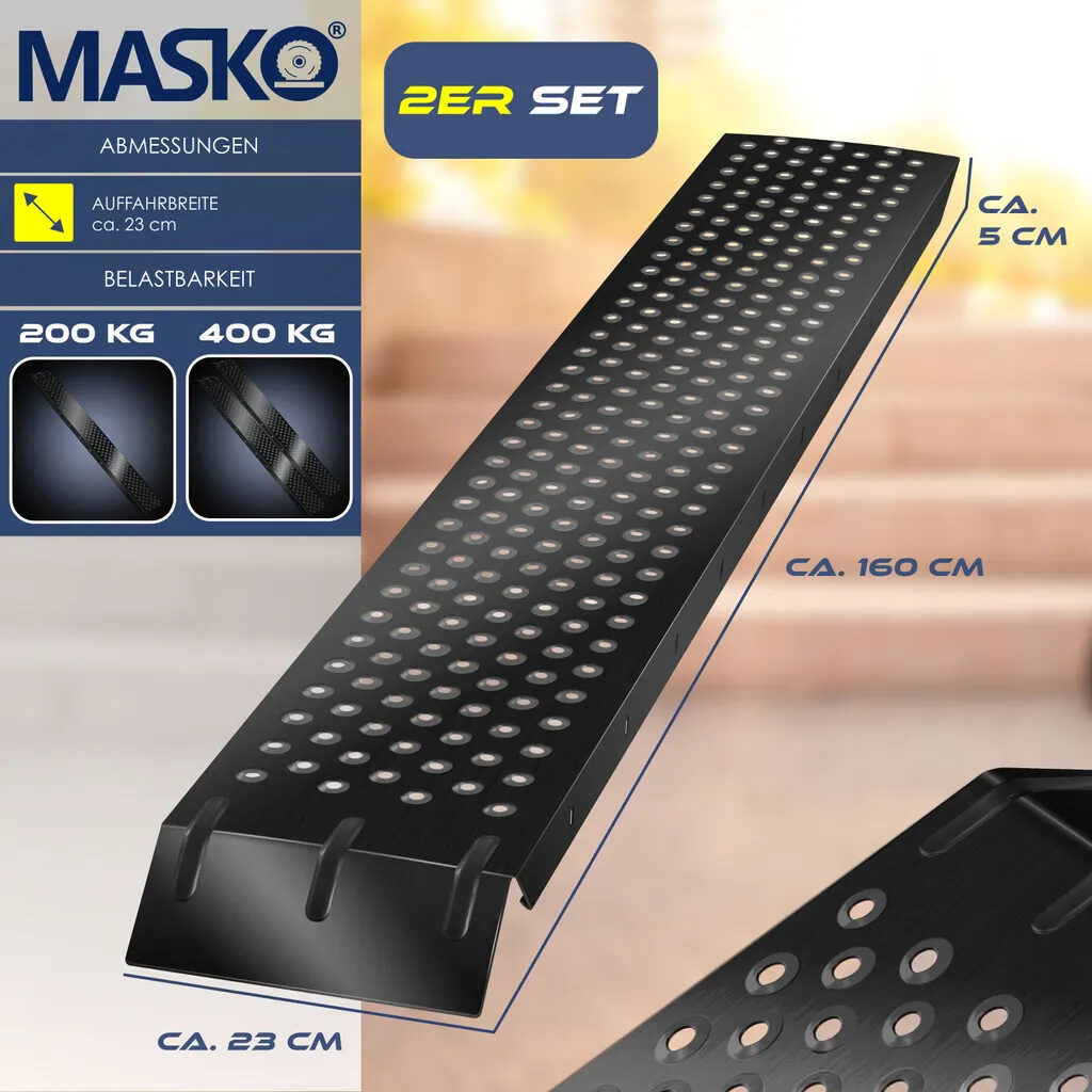 У комплект поставки входять 2 того, скільки вам потрібно місця та навантаження. З цим набором з 2 штук від MASKO у вас є все необхідне для завантаження важких предметів. Він ідеально підходить для професійних користувачів, яким потрібна високоякісна та надійна рампа для причепа, а також любителів своїми руками, яким часто доводиться вантажити важкі предмети.