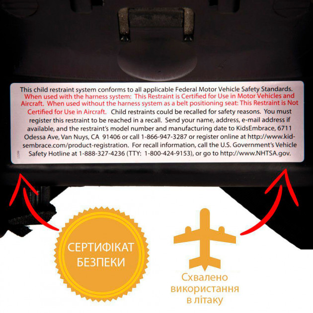 - Автокрісла KidsEmbrace відповідають Федеральному стандарту безпеки автотранспортних засобів 213 у США (FMVSS 213).