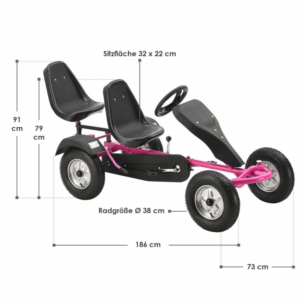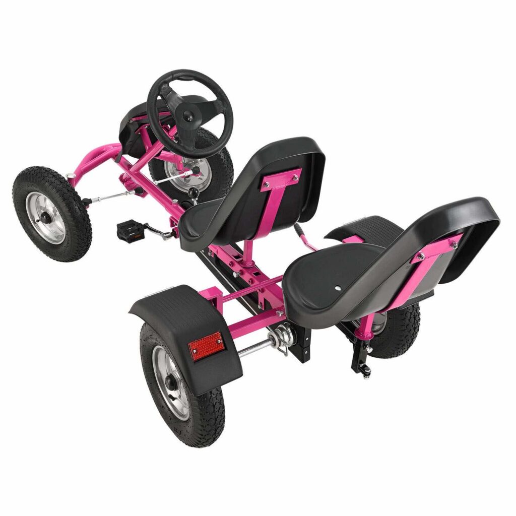 2-местный картинг Go-Kart (розовый) — идеальная игрушка для активного отдыха для детей в возрасте 8+*. Благодаря большим пневматическим шинам, цепному приводу и отключаемой муфтой свободного хода детский транспорт с педальным управлением доставляет удовольствие от вождения. Его можно двигать вперед и назад, легко управлять рулевым колесом и останавливать с помощью ручного тормоза заднего колеса. 2 регулируемых сиденья обеспечивают совместное удовольствие от вождения на свежем воздухе. Это также держит вашего ребенка в форме и повышает его способность реагировать.