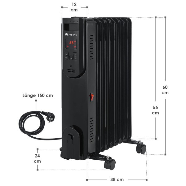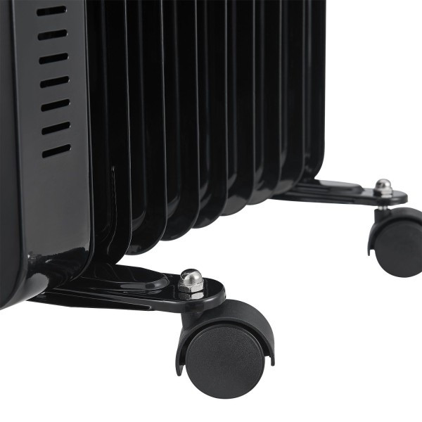 Мобільний і потужний практичний масляний обігрівач є ідеальним доповненням до вашої системи опалення. 9 випробуваних під тиском сталевих ребер, заповнених високоефективним термальним маслом. Три рівні нагріву з потужністю до 2000 Вт забезпечують приємну температуру у житловій зоні, гаражі чи офісі. Завдяки світлодіодному дисплею, який легко читається, ви завжди можете стежити за всіма налаштуваннями та бажаною температурою. Вбудований 12-годинний таймер також дозволяє автоматично вмикати та вимикати опалення. Для додаткової мобільності прилад розміром 38x24x60 см оснащений поворотними коліщатками та ручкою.Технічні характеристики: