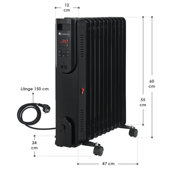 Мобільний і потужний практичний масляний обігрівач є ідеальним доповненням до вашої системи опалення. 9 випробуваних під тиском сталевих ребер, заповнених високоефективним термальним маслом. Три рівні нагріву з потужністю до 2500 Вт забезпечують приємну температуру у житловій зоні, гаражі чи офісі. Завдяки світлодіодному дисплею, який легко читається, ви завжди можете стежити за всіма налаштуваннями та бажаною температурою. Вбудований 12-годинний таймер також дозволяє автоматично вмикати та вимикати опалення. Для додаткової мобільності прилад розміром 47х24х60 см оснащений поворотними коліщатками та ручкою.
