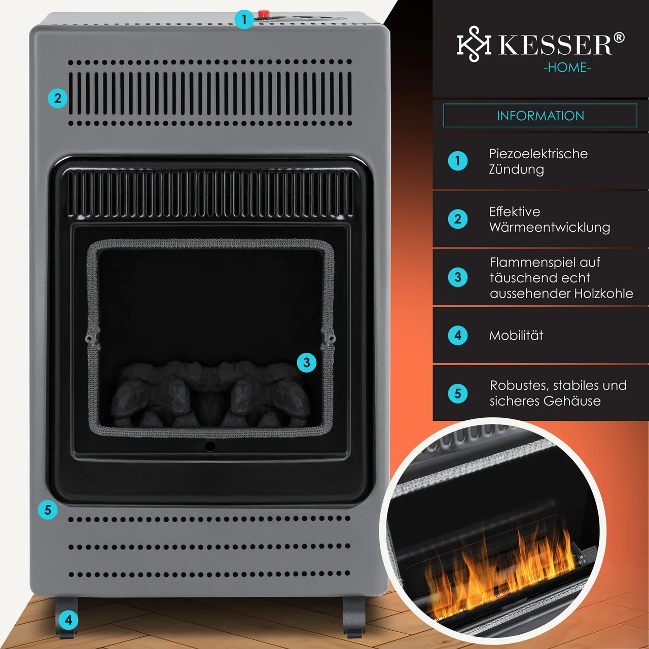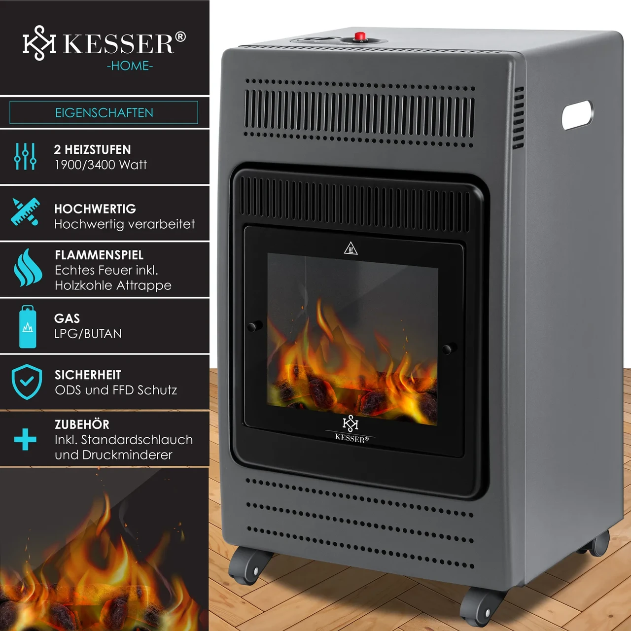 Газовий опалювальний камін KESSER з 2 рівнями нагріву 1900 або 3400 Вт, високоякісне виконання, справжній вогонь завдяки підведенню газу з фіктивним вугіллям, захист від ODS і FFD, включаючи редуктор тиску та стандартний шланг.