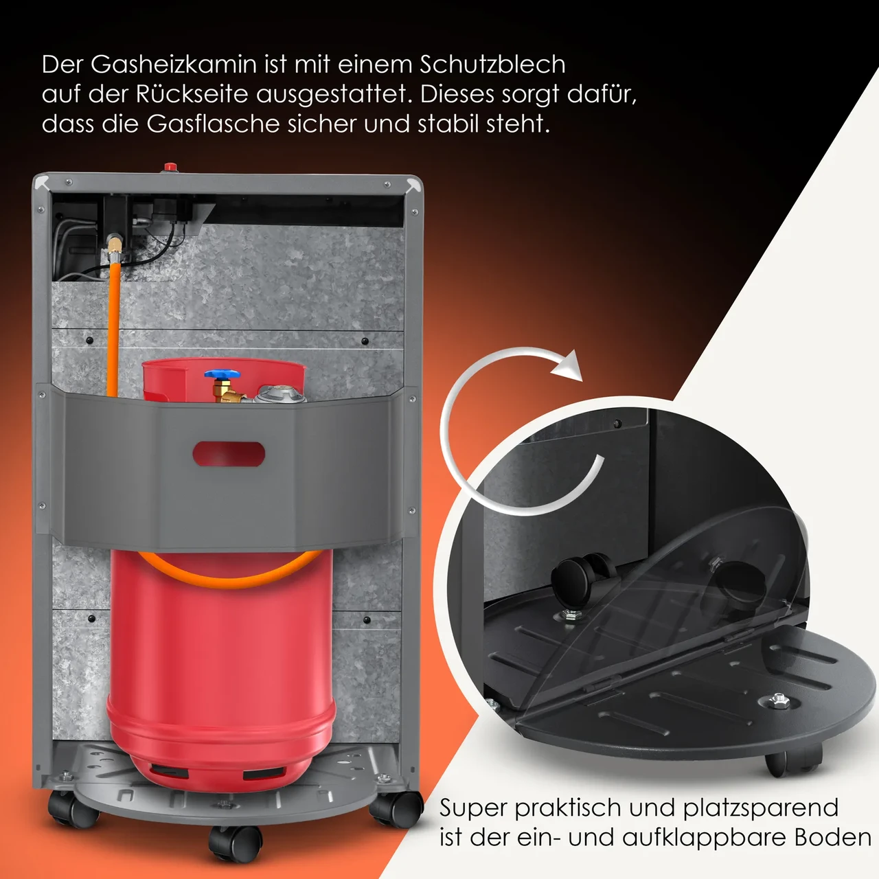 Міцний, стійкий і надійний корпус забезпечує максимальну безпеку. Обігрівач для патіо оснащений захисною пластиною на тильній стороні. Це гарантує, що газовий балон безпечний і стабільний з максимальною вагою 11 кг. Інші інтегровані системи безпеки включають систему зменшення кисню (ODS), яка вимірює наявність достатньої кількості кисню для згоряння. Це запобігає утворенню чадного газу. Вбудований пристрій для гасіння полум’я (FFD) запобігає проникненню горючого газу, коли полум’я гасне. Це запобігає накопиченню газу в самому обігрівачі.