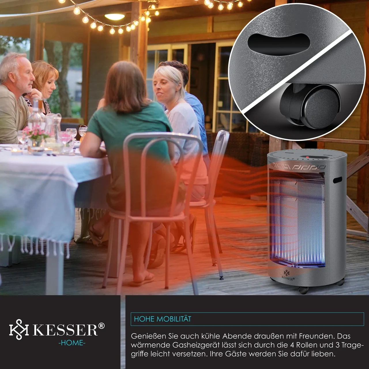 Круглий газовий обігрівач KESSER, елегантний дизайн, два рівні нагріву, природне тепло, повнорозмірна кришка бака, електричне розпалювання, включаючи стандартний шланг і дощовик, а також 3 лотка для транспортування та колеса на 360°