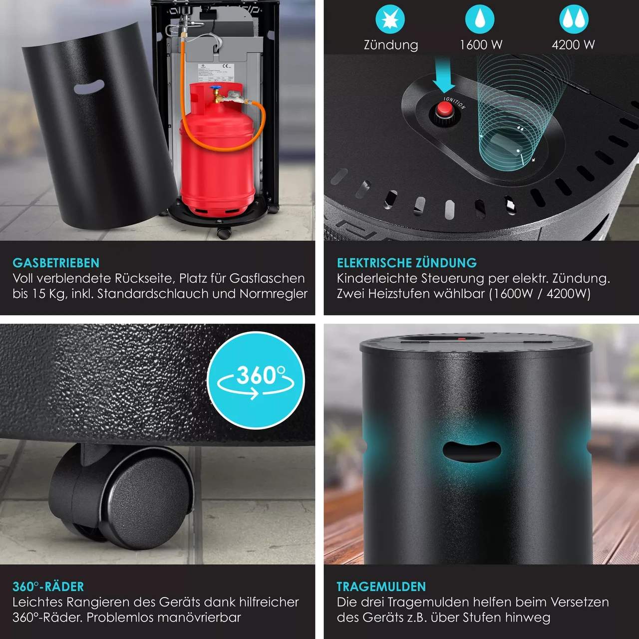 Круглий газовий обігрівач KESSER, елегантний дизайн, два рівні нагріву, природне тепло, повнорозмірна кришка бака, електричне розпалювання, включаючи стандартний шланг і дощовик, а також 3 лотка для транспортування та колеса на 360°