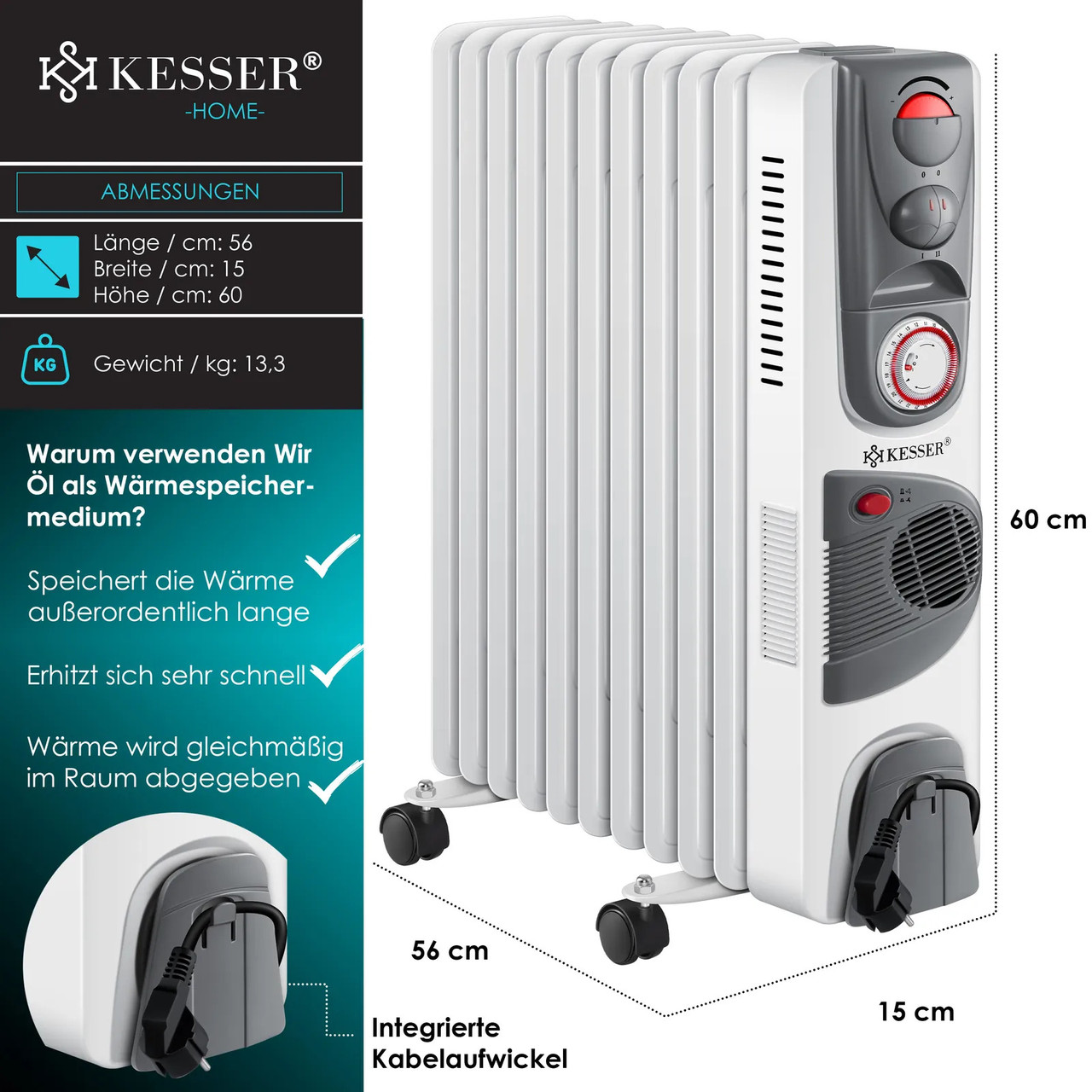 “Масляний електричний обігрівач з таймером KESSER 2500 Вт з 11 ребрами та з вентилятором 2500W Німеччина”