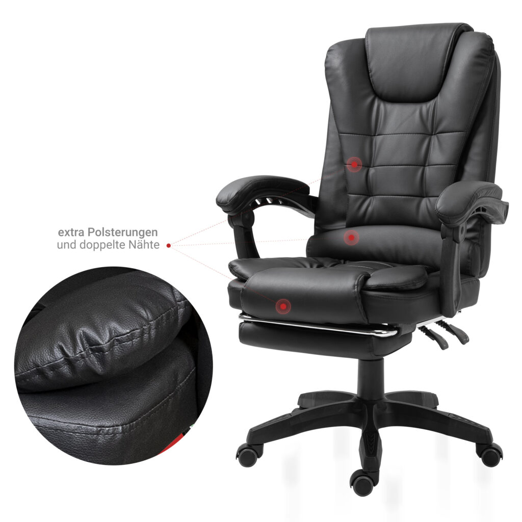 Гнучке крісло з елегантним дизайном, що імітує шкіру. Це офісне крісло оснащене м’якими гнучкими триточковими підлокітниками. Його можна встановити розслаблююче положення, а підлокітники адаптуються до цього положення. Для максимального розслаблення м’яку підставку для ніг можна вийняти. Крісло, що обертається, можна регулювати по висоті, а так само можна регулювати нахил спинки.