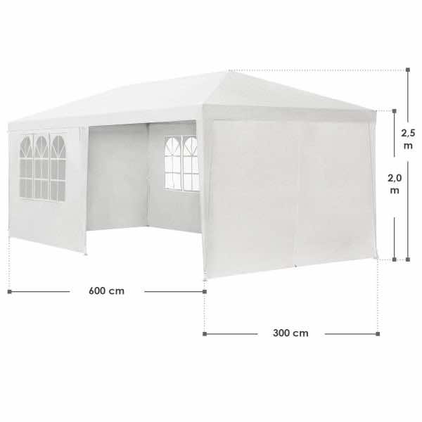 Цей павільйон стане ідеальним рішенням для будь-якого заходу на свіжому повітрі. Легкість у складанні та мобільності даної моделі дозволить Вам насолоджуватися природою в умовах комфорту та захищеності, куди б ви не поїхали: чи то ліс, водоймище. Можливість легко змінювати конструкцію павільйону, дозволить вам підлаштувати його під використання в різних цілях: як намет для проведення свята на природі;палатку. Розмір павільйону дозволить розмістити в ньому велику компанію. Міцні з'єднувальні деталі і розпірки, які йдуть в комплекті, забезпечать надійність конструкції. Легкий дощ і вітер не страшний, якщо у вас є таке прекрасне укриття. Однак, виробник не рекомендує перебувати у павільйоні під час грози, сильного дощу, граду і поривчастого вітру.Технічні характеристики: Матеріал рами: сталь. Матеріал покрівлі: поліетилен 100 г/м² (100%) Матеріал бічних частин: 90 г/м² поліетилен (100%) Колір садового намету: білий Бічна стінка з вікном: 4 Бічна панель на блискавці: 2 Кількість ніжок: 6 Кількість мотузок кріплення: 6 Кількість заземлених шипів: 12 Розміри (прибл.): Ширина: 300 см Глибина: 600 см Висота: 250 см Стрижневий дах: Ø 1,8 см Основа тарілки: Ø 2,4 см Підказки: УВАГА: садовий павільйон не забезпечує належного захисту під час шторму чи негоди. Не використовуйте під час грози, сильних поривів вітру, сильного дощу або граду. Альтанка не розрахована на таку погоду. Підходить тільки для приватного використання. Будь ласка, надійно встановіть святковий намет на рівній, сухій і твердій поверхні. Будь ласка, дотримуйтеся мінімальної відстані 3 метри до наступного намету. Неможливо з'єднати 2 намети разом. Обсяг поставки: 1 × вечірній намет 1 × Інструкція зі складання -