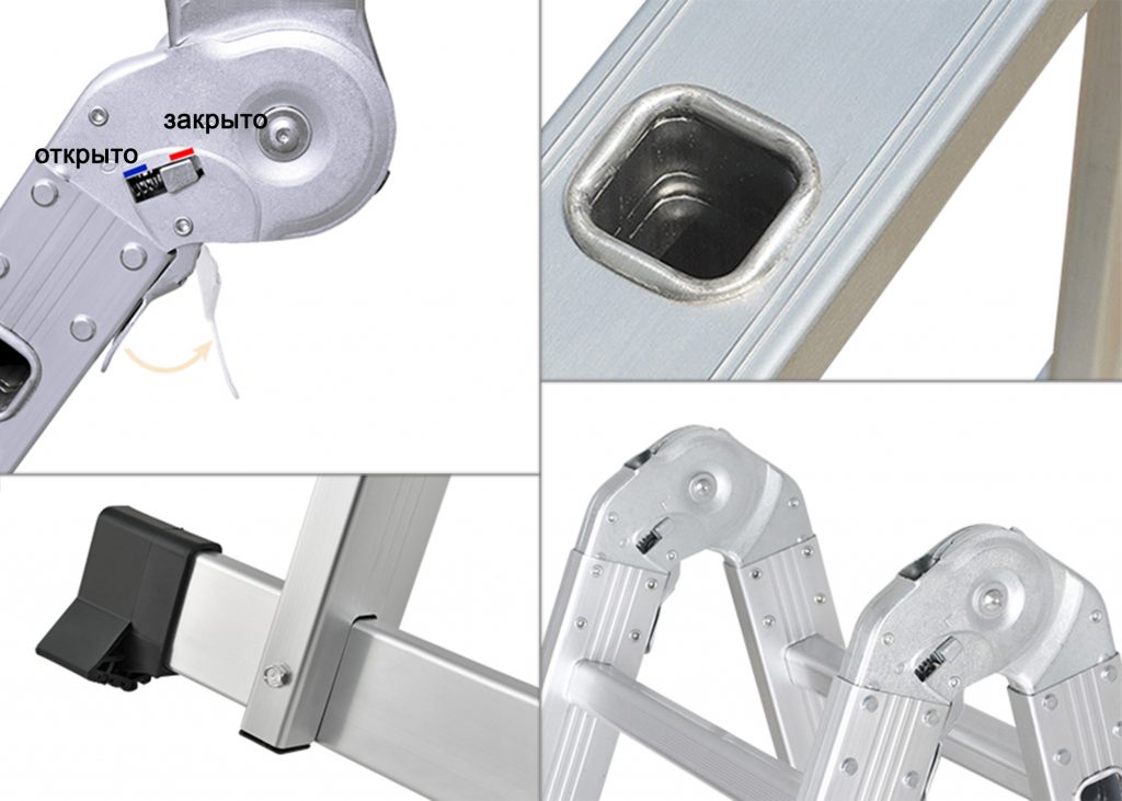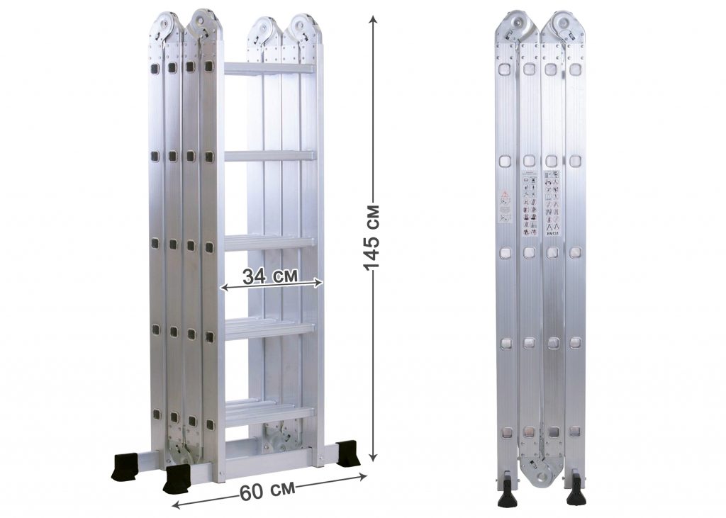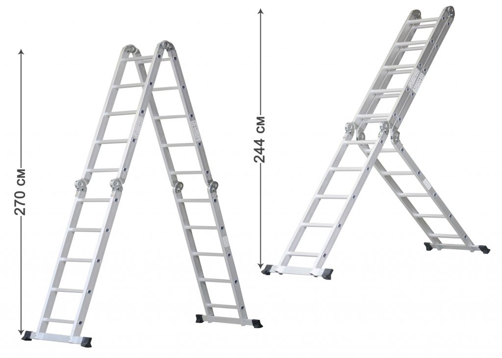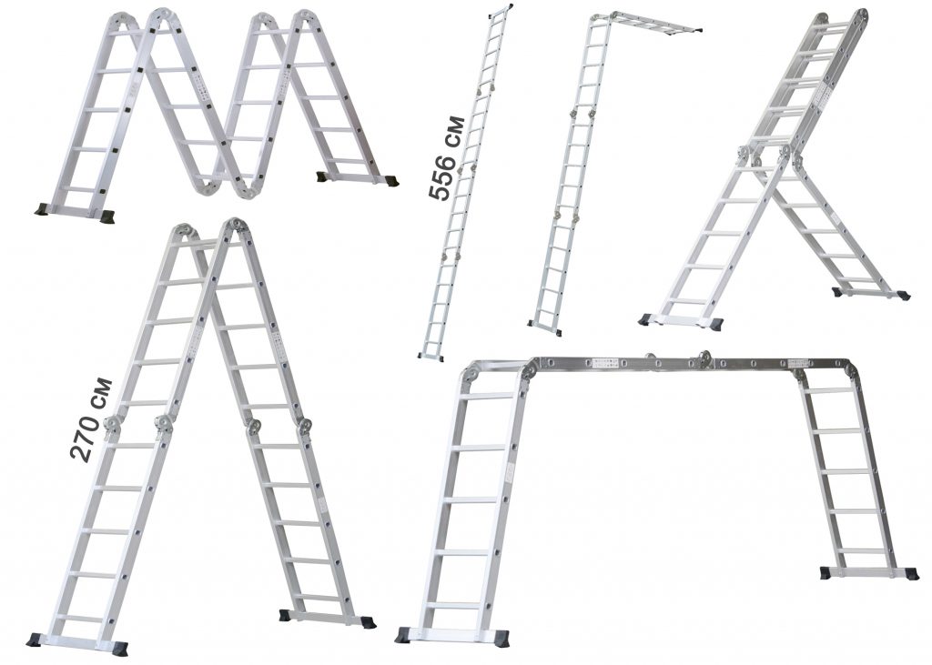 Найуніверсальніша драбинка з усіх існуючих. Двосторонні сходи, приставні сходи, дві окремі двосторонні сходи, робоча платформа (козли), висувні сходи – складно уявити, що все це можна отримати з алюмінієвої конструкції. Подумати тільки: весь цей «арсенал» вільно розміщується в багажнику автомобіля, на балконі, і навіть у коморі квартири. Ремонт, будівельні, монтажні, малярні, оздоблювальні роботи будуть виконуватися в рази легше та приємніше, якщо у вас є такий незамінний агрегат. Драбини з легкістю зможе переносити навіть одна людина, без будь-якої допомоги, а простота в складання тільки підтвердить правильність вашого вибору.
