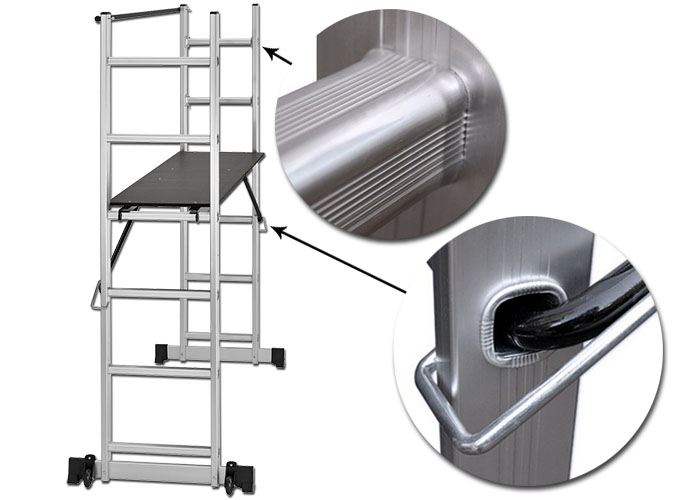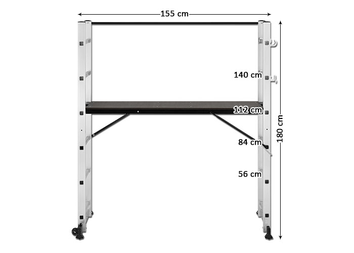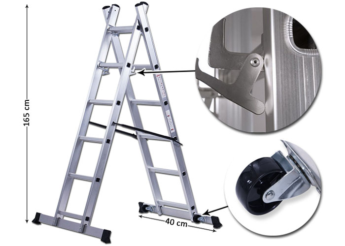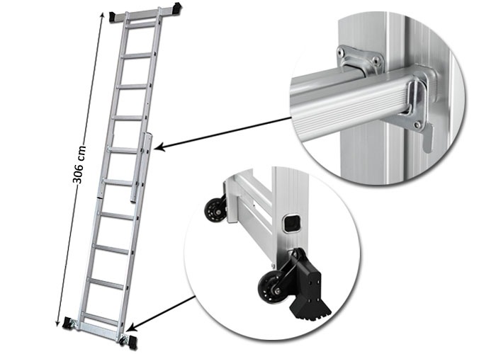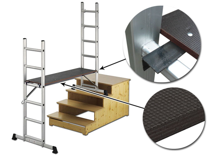 Дуже надійна, міцна та універсальна драбинка-поміст, незамінна при будівельних, оздоблювальних, малярських, монтажних роботах, у ремонті і т.д. Вона завжди стане в нагоді для господарських робіт у власному будинку або у дворі, але особливу користь і допомогу така драбинка принесе тим, хто займається будівельними роботами професійно. Швидкість у монтажі та зручність у пересуванні (за рахунок коліщаток) у кілька разів прискорить робочий процес, тим самим збільшуючи продуктивність вашої праці. Потужний алюмінієвий профіль, надійні фіксатори та опори для стійкості, протиковзне покриття, можливість встановлювати поміст навіть на поверхні з різним рівнем висоти (наприклад: одна сторона стоїть на підлозі, а друга – на сходах, як показано на фото) – це основні переваги даного помосту, що спонукають відмовитися від класичних. Крім того, універсальність цієї драбини дозволяє використовувати її ще і як двосторонні сходи, висувні сходи та приставні сходи. Дана модель стане правильною і справді вигідною інвестицією у вашу будівельну діяльність, або незамінним помічником господаря на власній ділянці.