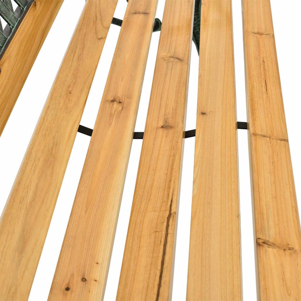 Благодаря деревянному каркасу толщиной 18 мм и прочному чугуну скамья устойчива к ветру и погодным условиям снаружи. Покрытие защищает древесину от внешних воздействий, таких как дождь и погода. Ножки соединены с сиденьем соединительными распорками, что обеспечивает дополнительную устойчивость и долговечность.